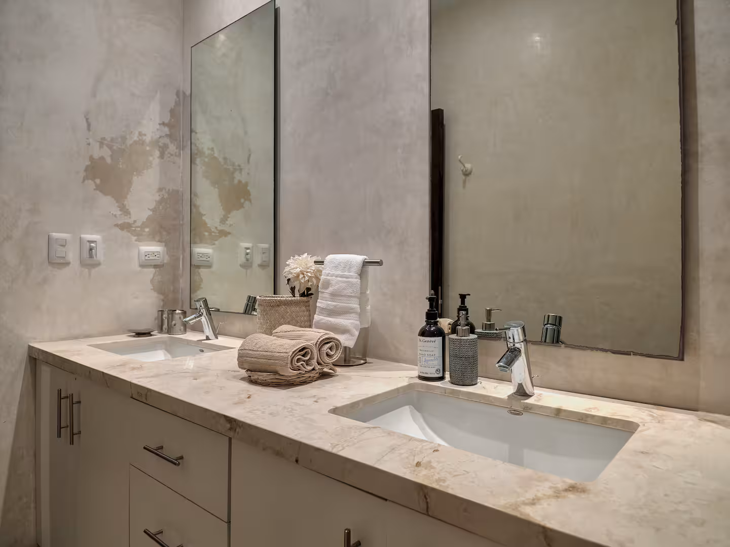 Enjoy a restful night’s sleep on the plush king-size bed, surrounded by custom built-in storage and soothing neutral tones. The room is fully air-conditioned and includes a ceiling fan for added comfort. The main bedroom includes an ensuite bathroom, complete with double sinks, a large marble vanity, and elegant fixtures. Thoughtfully stocked with essentials, this private space offers the ideal setup for couples or solo travelers who value both functionality and style.