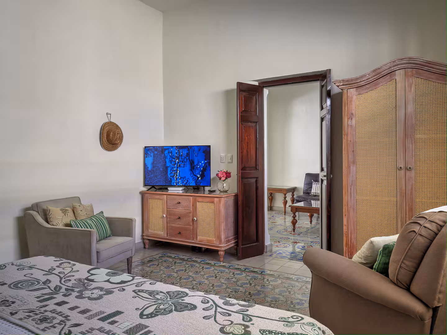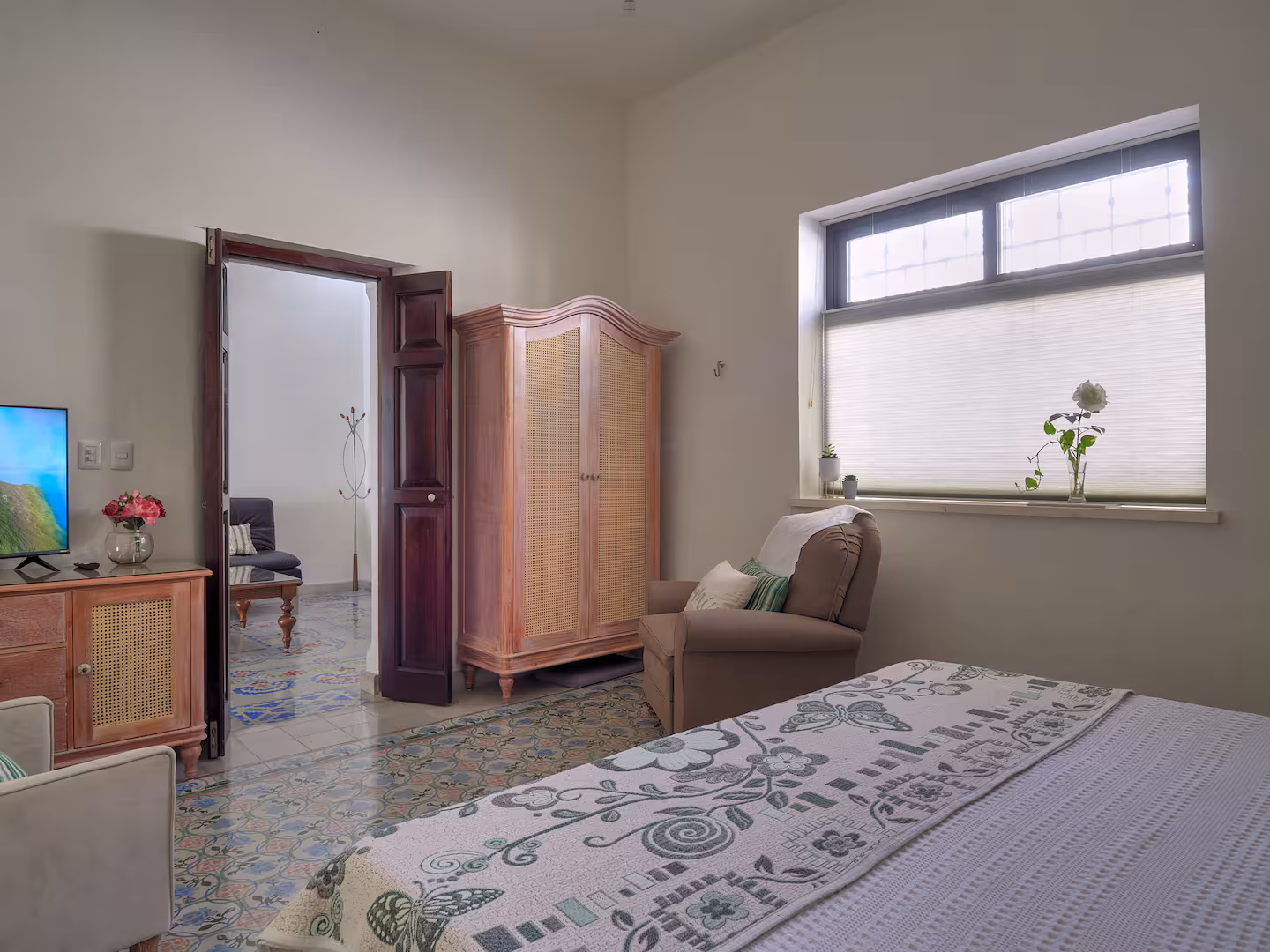 This inviting guest bedroom offers a cozy and peaceful retreat, perfect for friends, family, or an additional couple traveling together. Decorated with regional touches and beautiful pasta tile floors, the room features a comfortable king-size bed, plush seating, ample storage, and a smart TV for relaxing evenings.