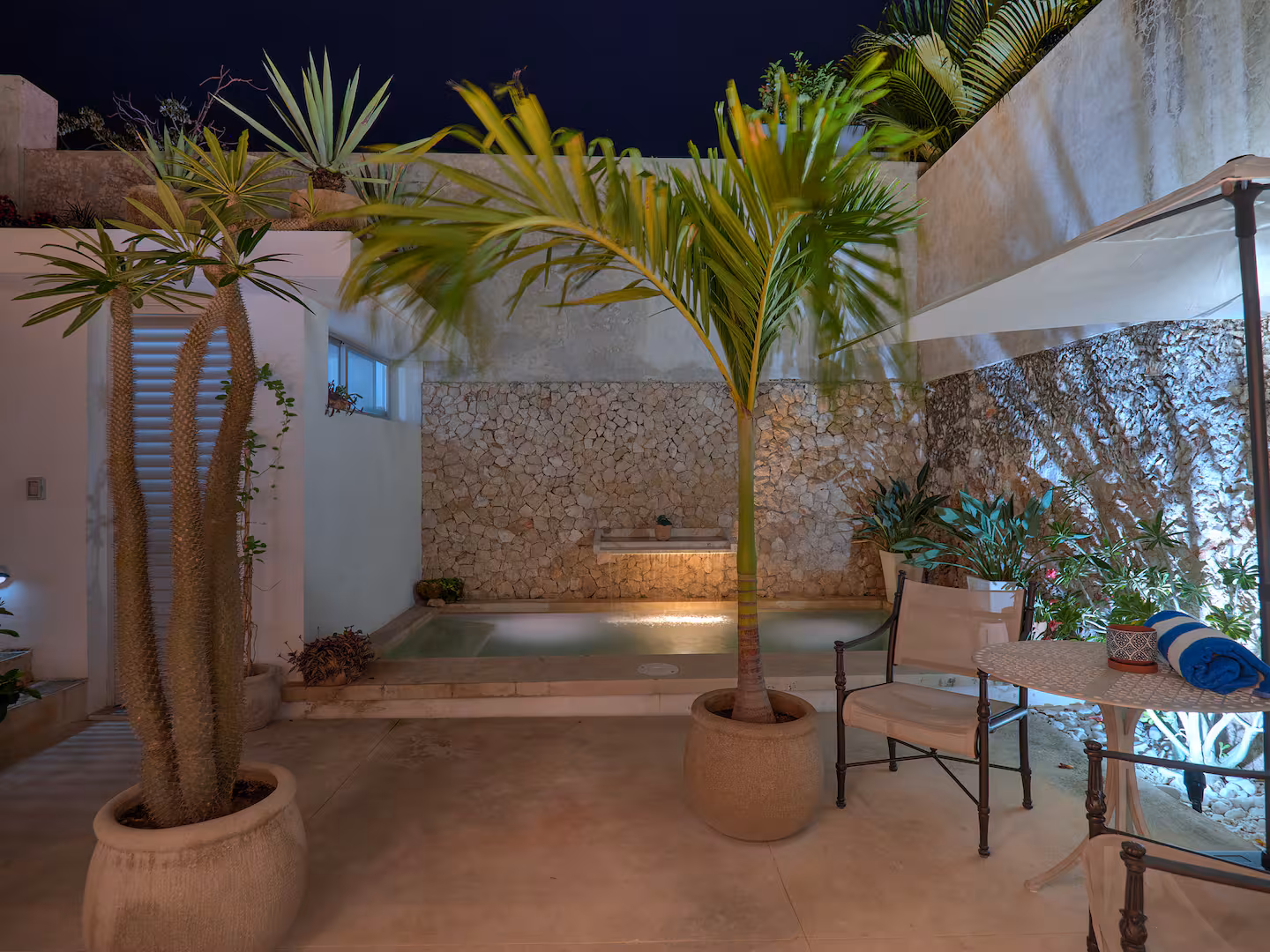 Step into your own private sanctuary in the heart of Mérida Centro. This serene patio and plunge pool area is the perfect escape from the city’s warmth—ideal for a morning coffee, midday swim, or evening cocktails under the stars. Surrounded by rustic stone walls and lush tropical plants, the space blends natural beauty with modern comfort. Lounge by the pool with a good book or take a refreshing dip in the water. Enjoy meals or drinks at the shaded outdoor bistro set, all while being just steps away from the kitchen and indoor living area through large sliding glass doors.